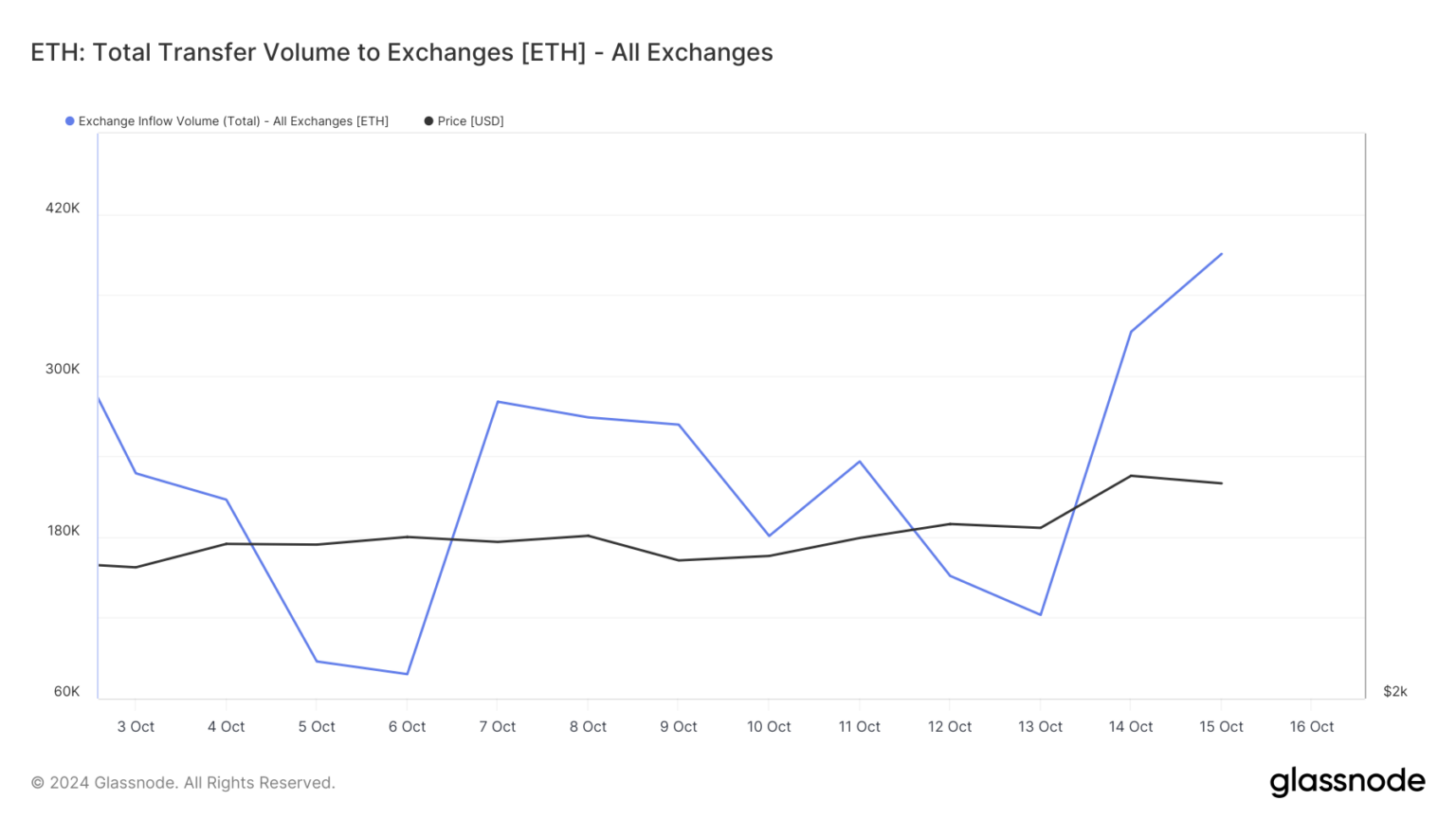 Dòng chảy vào sàn giao dịch cho thấy số lượng coin rời khỏi ví ngoài và đi vào các nền tảng tập trung. Sự tăng đáng kể số lượng ETH trên các sàn giao dịch có thể chỉ ra áp lực bán ra tăng cao. Đáng chú ý, việc chuyển nhiều coin hơn vào các sàn giao dịch thường cho thấy rằng các nhà nắm giữ có thể đang chuẩn bị thanh lý tài sản của họ.