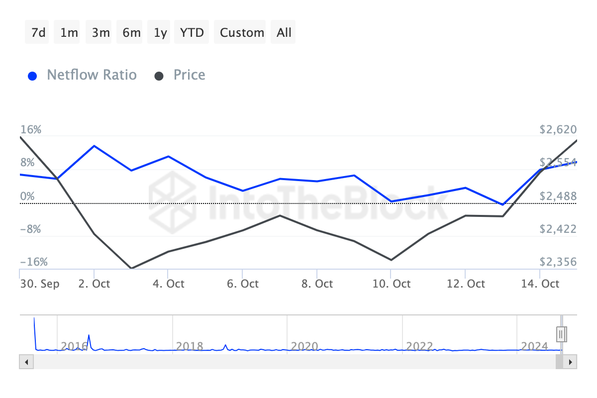 Một đánh giá on-chain khác cho thấy các cá voi tiền điện tử đã góp phần vào sự sụt giảm giá gần đây của Ethereum. Theo IntoTheBlock, tỷ lệ dòng tiền ròng của các nhà nắm giữ lớn đến sàn giao dịch đã tăng trong bảy ngày qua. Tỷ lệ này cung cấp cái nhìn sâu sắc về hoạt động của cá voi. Khi nó giảm, điều này cho thấy các cá voi đang rút tài sản ra khỏi các sàn giao dịch, thường là dấu hiệu của xu hướng tăng giá khi họ có thể đang giữ lâu dài.