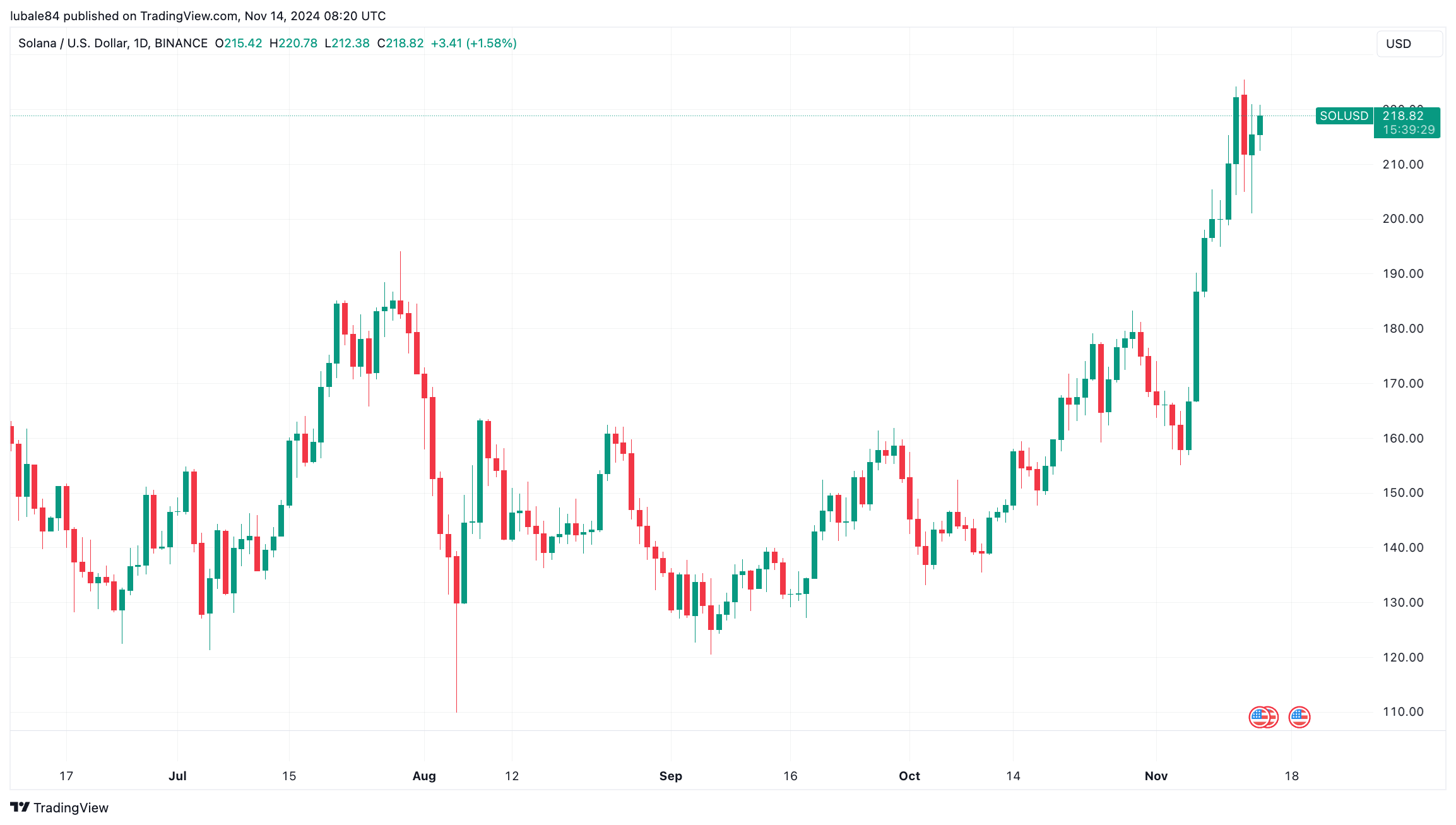 Giá của Solana đã tăng 13% trong bảy ngày qua và giao dịch ở mức 218 USD vào ngày 14 tháng 11.