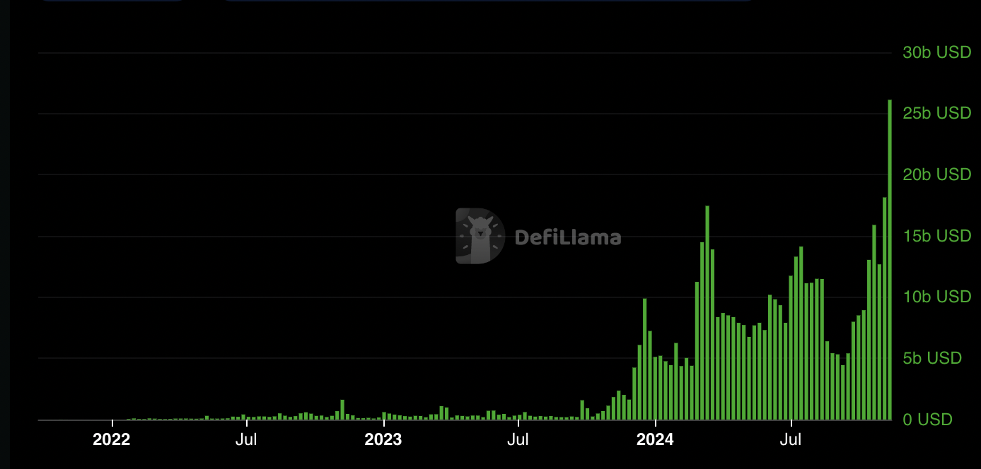 Khối lượng DEX hàng tuần trên Solana tăng vọt lên mức cao nhất mọi thời đại là 26,1 tỷ USD trong tuần kết thúc vào ngày 11 tháng 11, tăng 43% so với mức 18,1 tỷ USD của tuần trước. Đáng chú ý, Solana chiếm 37% thị phần, thậm chí vượt qua cả blockchain tập trung vào ứng dụng phi tập trung (DApp) hàng đầu, Ethereum, đã ghi nhận khối lượng DEX là 13 tỷ USD trong tuần kết thúc vào ngày 11 tháng 11.