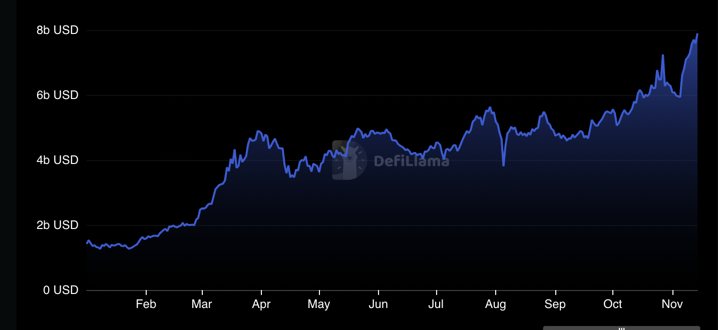 Dữ liệu bổ sung từ DefiLlama cho thấy TVL trên Solana đã tăng lên 7,9 tỷ USD vào ngày 13 tháng 11, tăng 460% kể từ đầu năm và là mức cao nhất kể từ tháng 12 năm 2021. Các DApp chính như Jito, Raydium, Marinade và hoạt động staking thanh khoản của Binance đã đóng góp đáng kể vào lượng tiền gửi ngày càng tăng trên Solana.