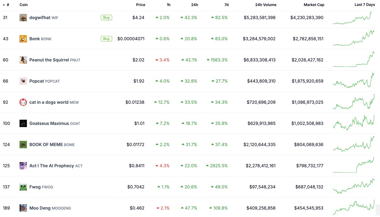 Đợt tăng giá của Solana vào ngày 14 tháng 11 trùng với đợt điều chỉnh giá memecoin đang diễn ra trên mạng của nó. Hầu hết đều ghi nhận mức tăng trưởng hàng ngày hai chữ số, như thể hiện trong hình bên dưới.