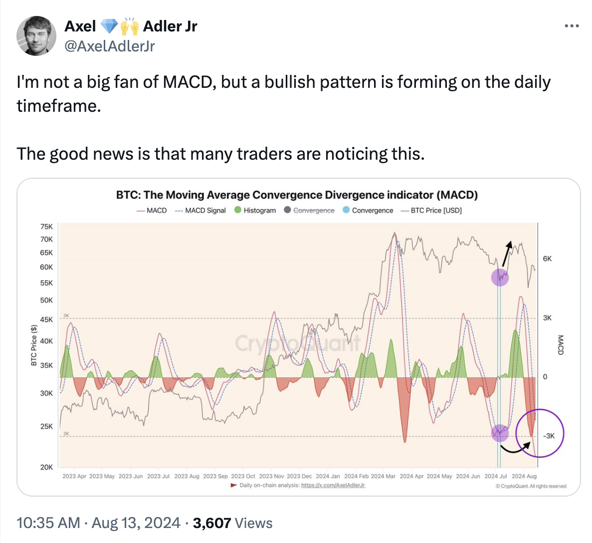 Adler Jr. đã chia sẻ một biểu đồ trong bài đăng ngày 13 tháng 8 trên X cho thấy MACD nằm sâu trong vùng tiêu cực. Kịch bản tương tự đã được chứng kiến vào ngày 8 tháng 7, khi giá BTC đạt mức thấp là 53.550 USD.