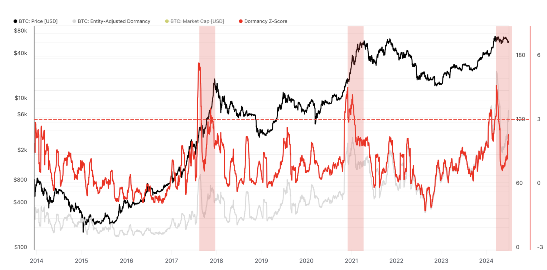 Vâng, giờ đã là ba tháng sau. Giá chỉ giảm và đỉnh Z-Score của Dormancy vẫn duy trì với cấu trúc rất giống với đỉnh năm 2017 và 2021.