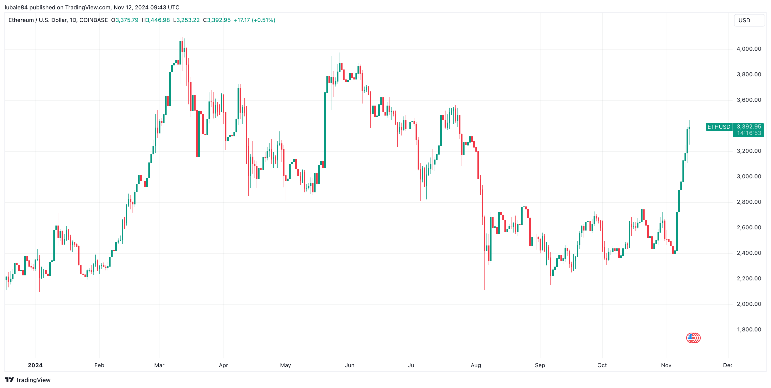 Sự phấn khích ngày càng tăng về môi trường kinh doanh thân thiện với tiền điện tử tại Hoa Kỳ sau chiến thắng trong cuộc bầu cử tổng thống của Donald Trump đã khiến giá Ether tăng vọt hơn 37% trong bảy ngày qua và đạt mức cao chưa từng thấy kể từ ngày 24 tháng 7.
