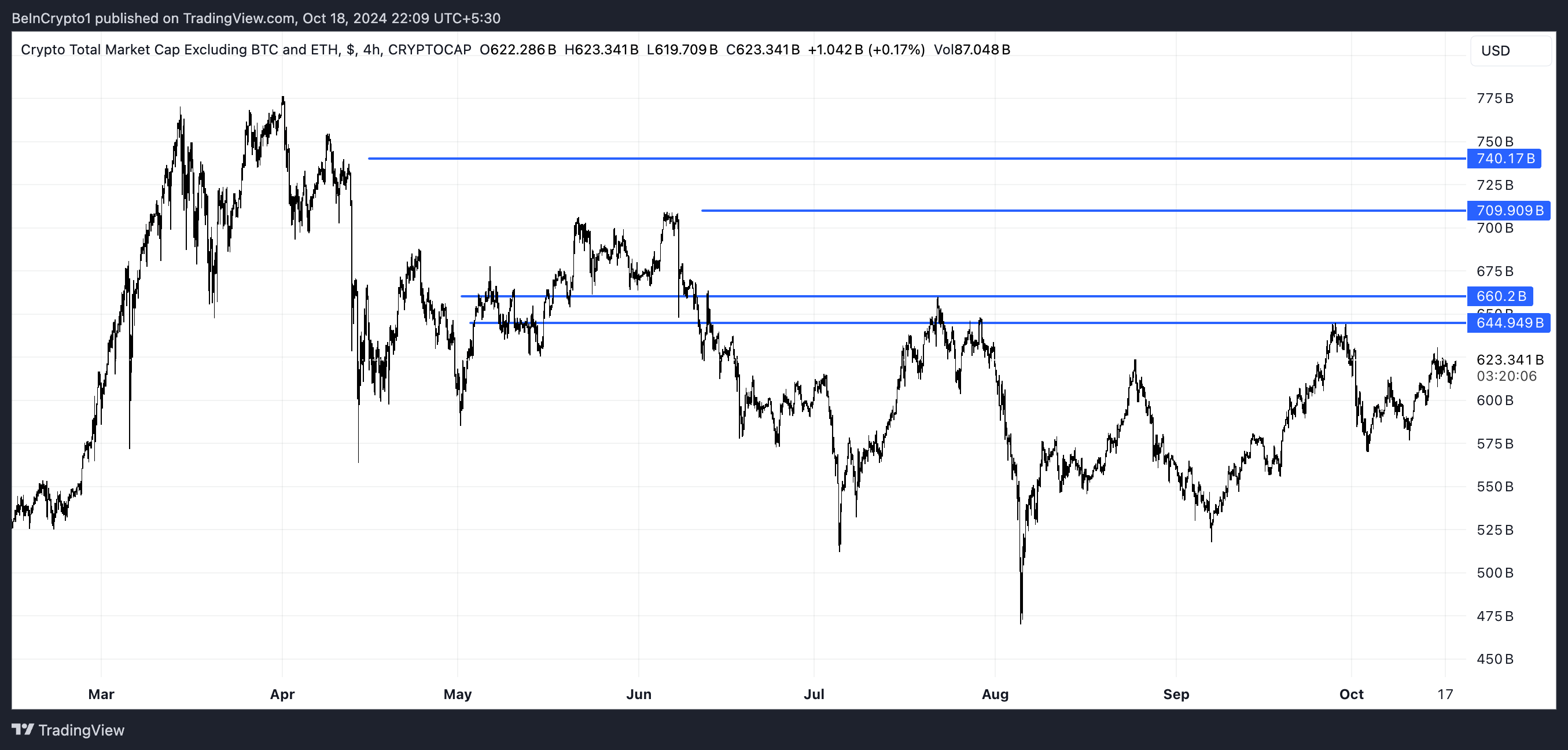 Nếu mức kháng cự này bị phá vỡ, thị trường tiền điện tử, ngoại trừ BTC và ETH, có thể chứng kiến một đợt tăng giá đáng kể, thử nghiệm vốn hóa thị trường quanh mức 660 tỷ USD, 709 tỷ USD và thậm chí là 740 tỷ USD. Điều này thể hiện mức tăng tiềm năng 20% so với mức hiện tại, làm nổi bật sự biến động và cơ hội trong lĩnh vực altcoin.
