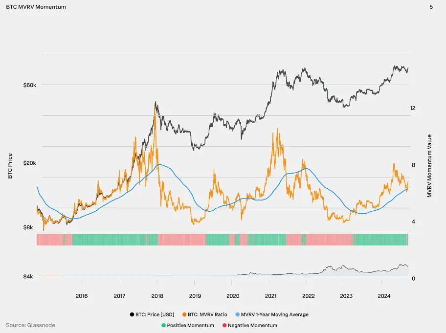 Chỉ số Market Value to Realized Value (MVRV) Momentum theo dõi sức mạnh, hướng và độ bền của xu hướng thị trường. Miễn là chỉ số này (màu cam) ở trên trung bình di động 365 ngày (màu xanh), xu hướng tăng giá của Bitcoin sẽ tiếp tục. Theo đó, các nhà phân tích tìm kiếm tín hiệu này để tăng cường nắm giữ có thể tận dụng các đợt điều chỉnh giá để mua BTC, miễn là điều kiện trên được đáp ứng.