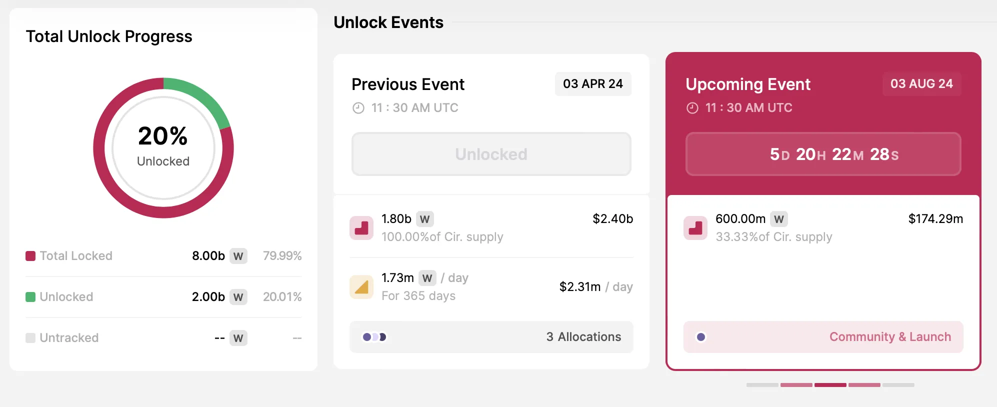 Vào ngày 3 tháng 8, Wormhole sẽ mở khóa 600 triệu token, chiếm 6,02% nguồn cung tối đa. Việc phát hành token theo kế hoạch đã gây ra nhiều phản ứng trái chiều từ cộng đồng tiền điện tử, một số người coi đây là sự phát triển tích cực cho tính thanh khoản, trong khi những người khác bày tỏ lo ngại về tác động tiềm tàng của thị trường.