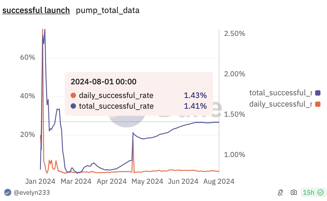 Dữ liệu của Dune Analytics cho thấy tỷ lệ thành công của các token tiền điện tử từ pump.fun được đưa vào giao thức tài chính phi tập trung Raydium dựa trên Solana là 1,41%, dao động trong khoảng từ 1,21% đến 1,21% kể từ tháng 5. Mức cao nhất mọi thời đại là 2,56% đạt được vào ngày 16 tháng 2.