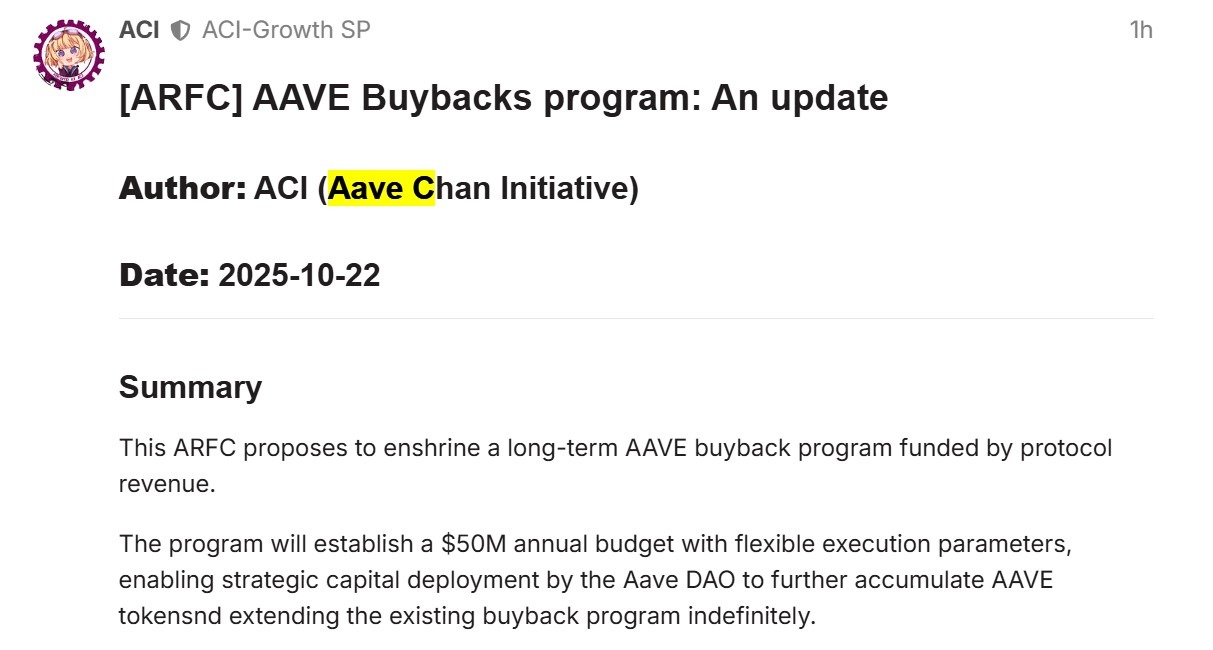 Tổ chức tự trị phi tập trung (DAO) của Aave đã đưa ra một đề xuất nhằm tạo ra một chương trình mua lại dài hạn, được tài trợ bởi giao thức, sử dụng tối đa $50 triệu từ doanh thu hàng năm để mua lại token Aave.