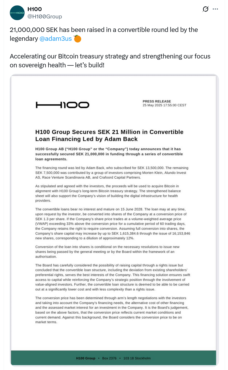 Theo H100, động thái này khiến họ trở thành công ty đại chúng đầu tiên tại Thụy Điển áp dụng chính sách kho bạc bằng Bitcoin, và cũng là một trong những công ty đầu tiên ở châu Âu thực hiện điều này.