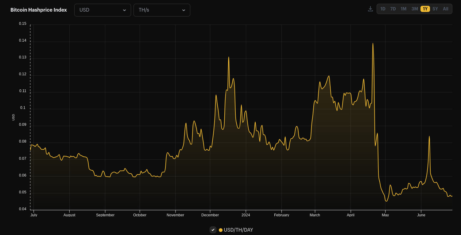 Chỉ tính riêng từ ngày 8 tháng 6 đến ngày 24 tháng 6, hash price, phản ánh doanh thu dự kiến trên mỗi exahash, đã giảm 50%.