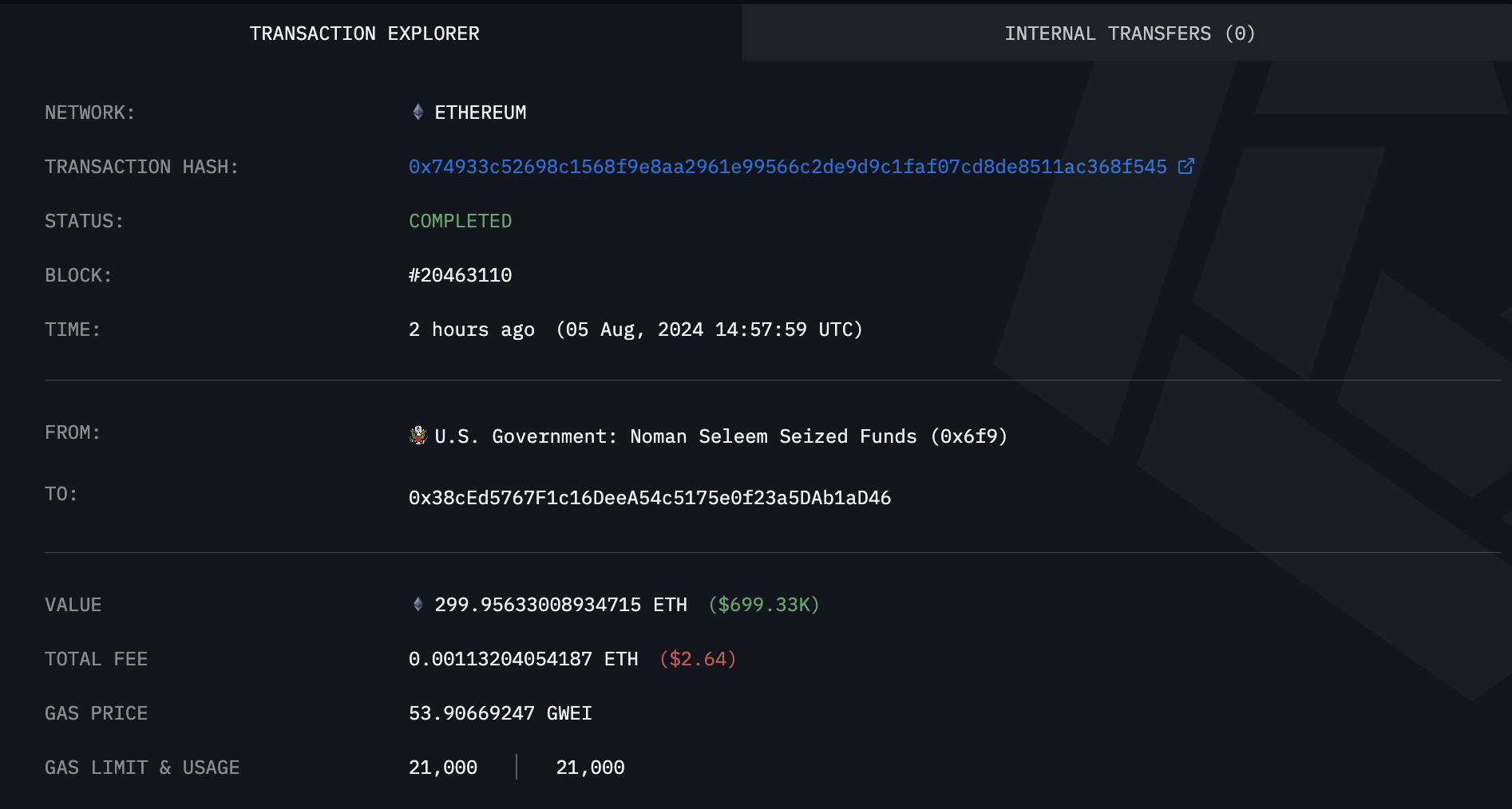 Theo Arkham Intelligence, một ví được cho là do chính phủ Hoa Kỳ kiểm soát đã chuyển 300 Ether (ETH), trị giá khoảng 699.000 USD, đến một địa chỉ ví có đuôi là “d46” vào ngày 5 tháng 8.