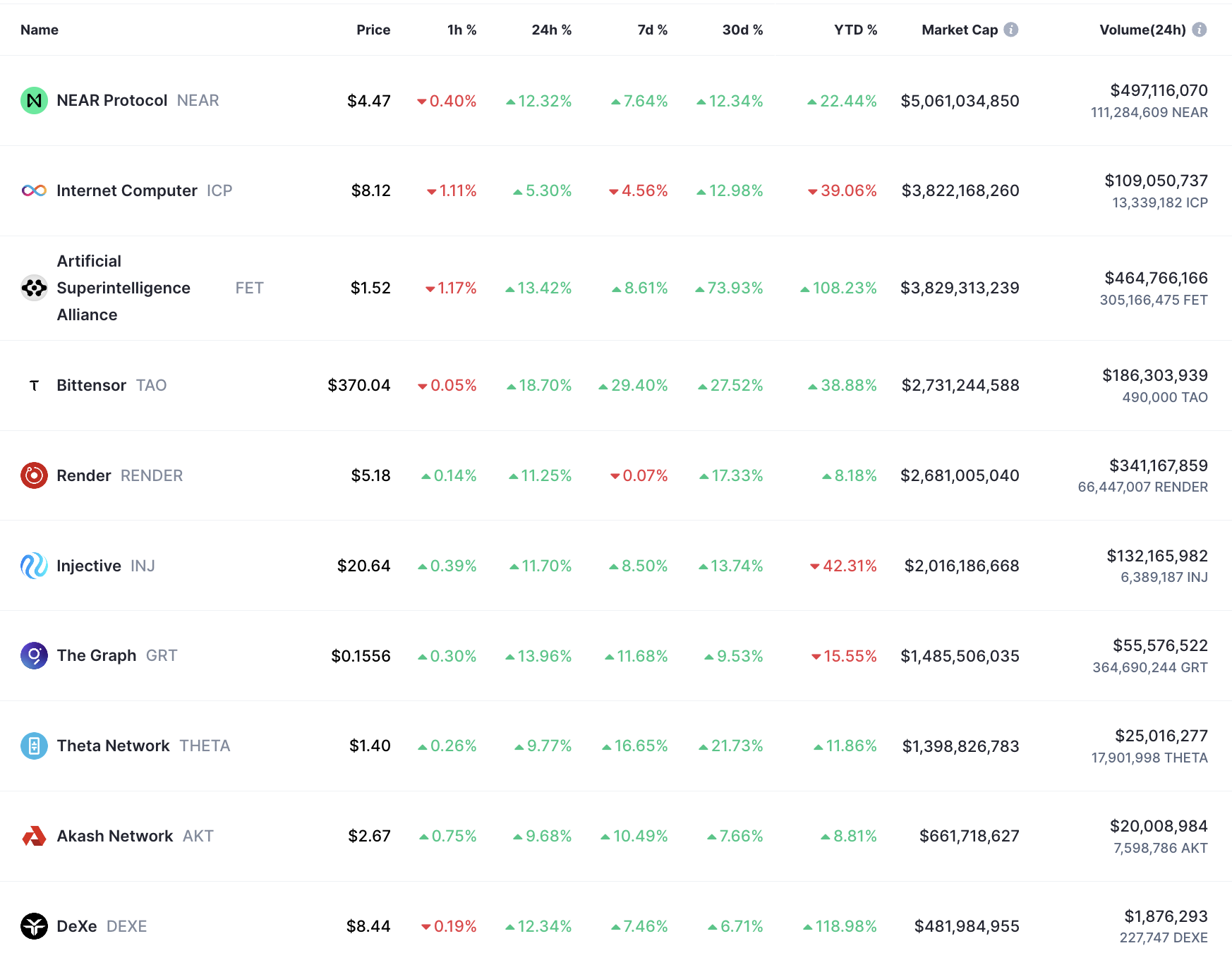 Các token theo chủ đề trí tuệ nhân tạo đã tăng vọt trong 24 giờ qua, đạt mức tăng hai chữ số khi thị trường đón nhận động thái cắt giảm lãi suất 50 điểm cơ bản của Cục Dự trữ Liên bang Hoa Kỳ.