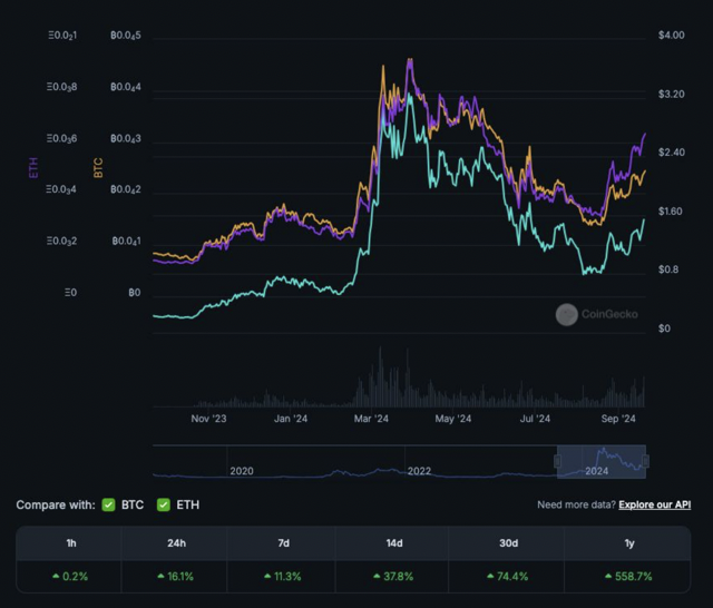 Artificial Superintelligence Alliance (FET)—một nhóm gồm Fetch.ai, Ocean Protocol và SingularityNET—là một đơn vị hoạt động hiệu quả ngày hôm nay, với token FET tăng khoảng 15% trong 24 giờ qua và đạt 1,54 USD vào ngày 19 tháng 9.