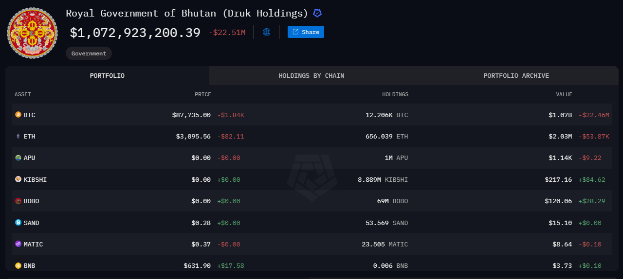 Dữ liệu của Arkham cho thấy Bhutan vẫn nắm giữ 12.206 Bitcoin, hiện có giá trị gần 1,11 tỷ USD. Những tài sản này được quản lý bởi Druk Holding & Investments. Chính phủ dường như tận dụng sự tăng giá, bán một phần tài sản nắm giữ của mình trong các đợt tăng giá của thị trường.