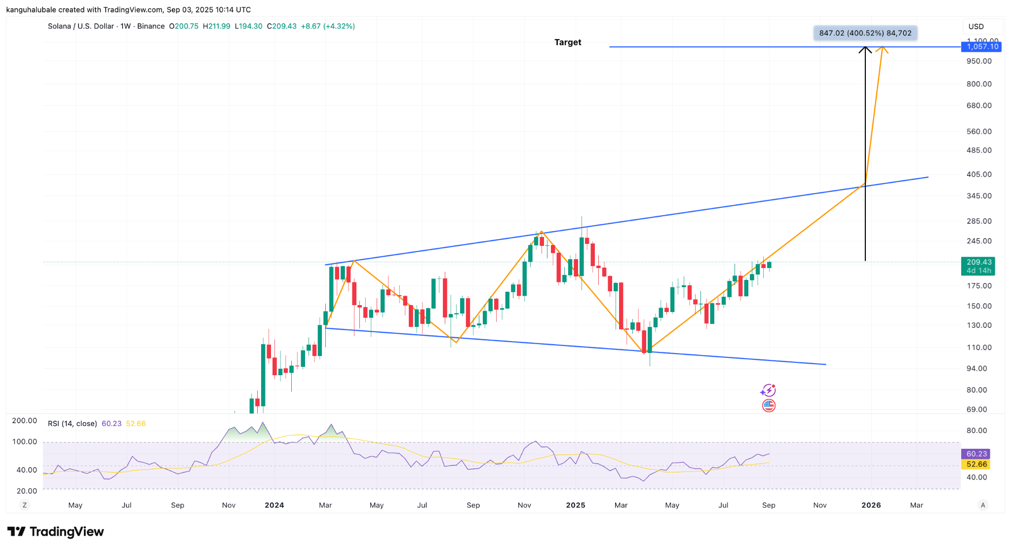 Diễn biến giá của Solana đã vẽ nên một mô hình megaphone tăng giá trên biểu đồ hàng tuần, có thể đẩy giá SOL lên bốn chữ số, dữ liệu từ TradingView cho thấy.