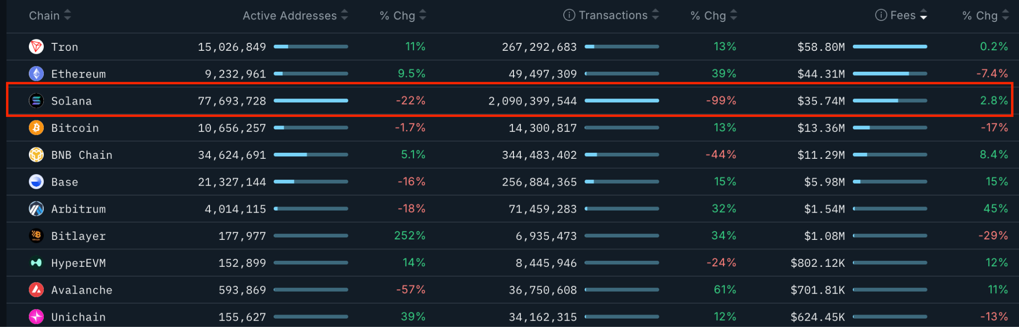 Ngược lại, theo dữ liệu của Nansen, giao dịch Ethereum tăng 39% trong cùng kỳ. Số lượng địa chỉ hoạt động của Solana cũng giảm 22%, cho thấy mức sử dụng mạng giảm.