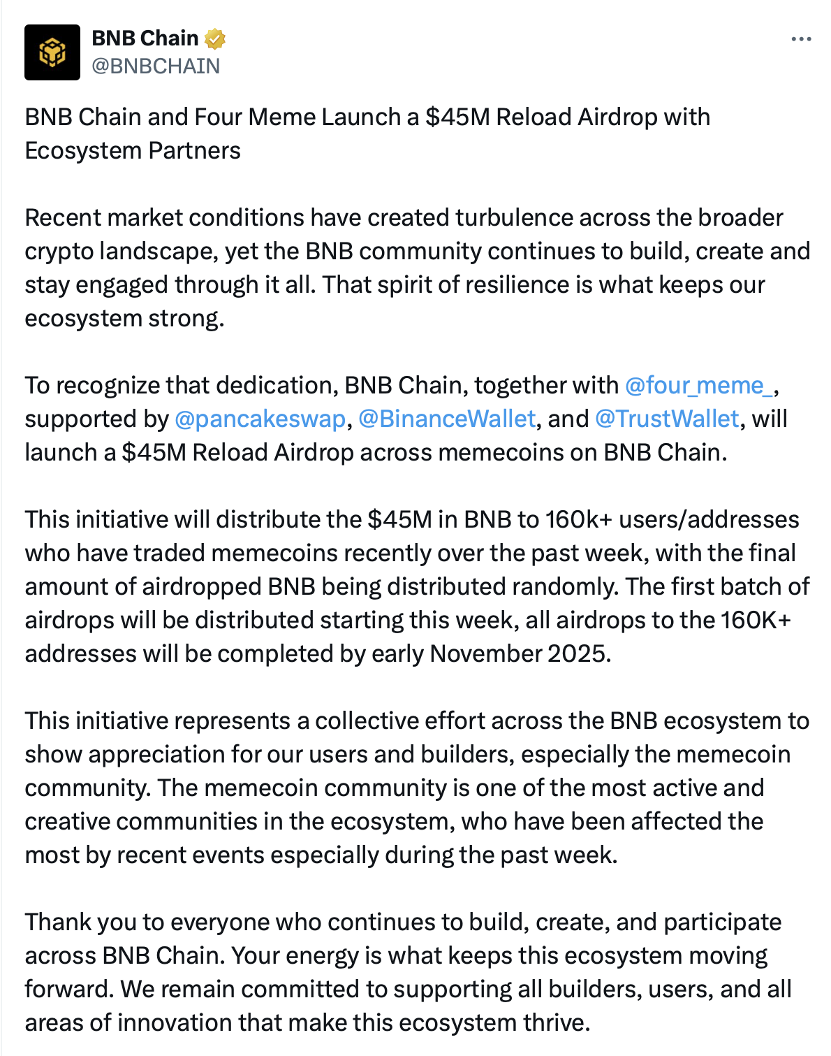 Mạng lưới cho biết sáng kiến này sẽ phân phối token BNB cho hơn 160.000 địa chỉ đủ điều kiện. Aidrops sẽ bắt đầu trong tuần này và hoàn thành vào đầu tháng 11.