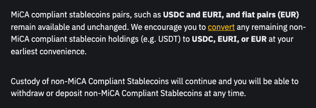 Một đoạn trích từ thông báo của Binance về việc hủy niêm yết các stablecoin không tuân thủ MiCA. Nguồn: Binance.