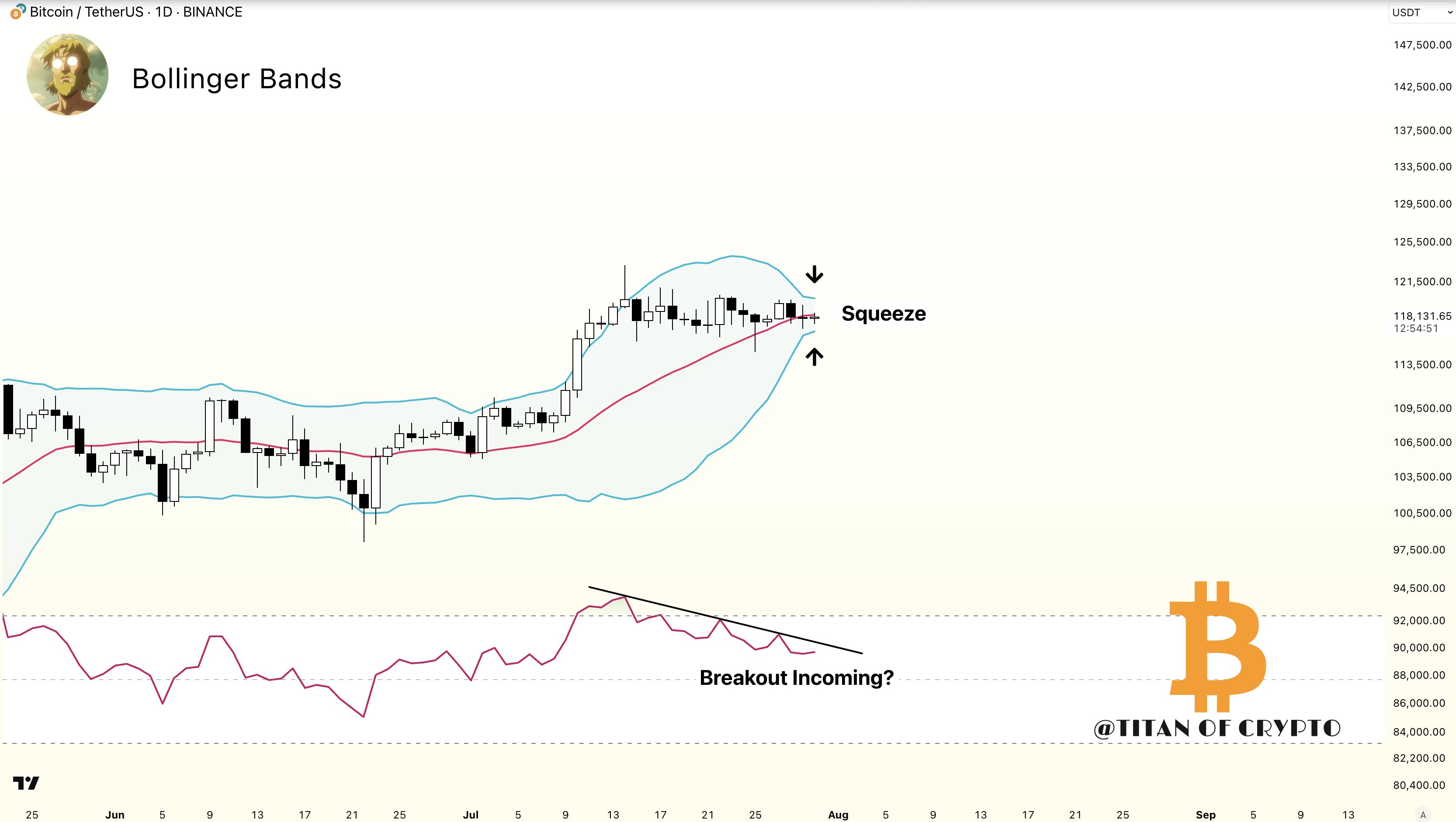 Bitcoin vẫn giữ vị thế trung lập, và động thái quyết định tiếp theo có thể diễn ra sau cuộc họp của Ủy ban Thị trường Mở Liên bang (FOMC). Nhận định về khả năng biến động, nhà giao dịch Titan of Crypto chỉ ra sự thắt chặt của dải Bollinger trên biểu đồ hàng ngày, một chỉ báo kỹ thuật đo lường biến động. Khi các dải này co lại, nó thường báo hiệu một sự bứt phá hoặc sụp đổ lớn sắp xảy ra. Nhà phân tích cho biết: