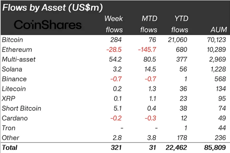 Các sản phẩm đầu tư tài sản kỹ thuật số đã ghi nhận tuần thứ hai liên tiếp có dòng tiền chảy vào, tổng cộng là 321 triệu USD. Dòng tiền chảy vào hàng tuần mới giảm nhẹ so với tuần trước, với tổng cộng là 436 triệu USD.