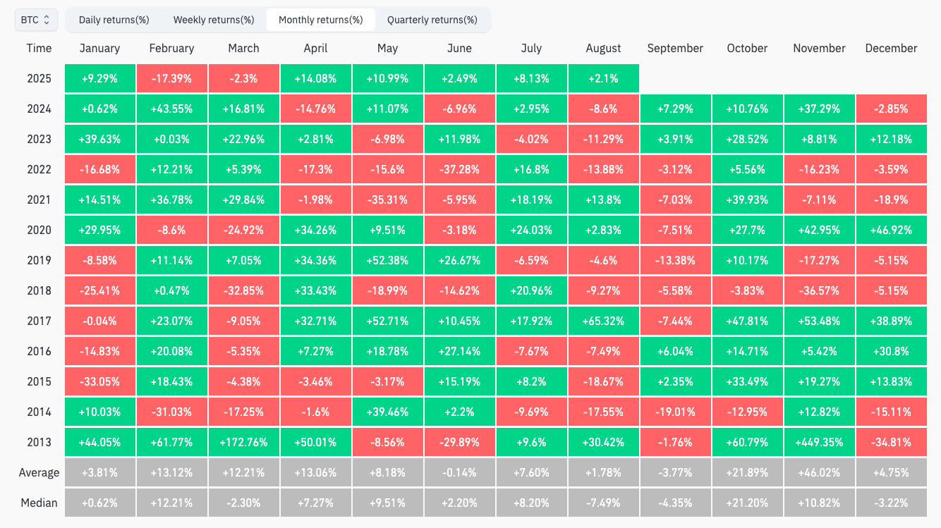 Dữ liệu từ nguồn theo dõi CoinGlass cho thấy cặp BTC/USD đã tăng 2,1% trong tháng 8, cao hơn một chút so với mức trung bình 1,8%. Ngược lại, tháng 9 trung bình giảm 3,8%.