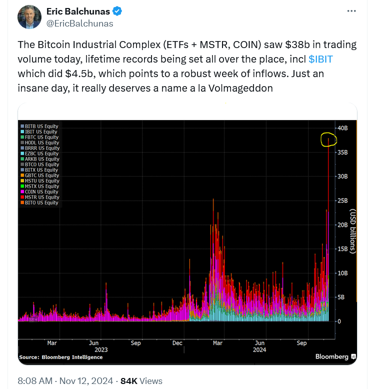 Đợt tăng giá 11% lên 89.500 USD của Bitcoin vào ngày 11 tháng 11 đã thúc đẩy các quỹ Bitcoin ETF spot của Hoa Kỳ, MicroStrategy Inc (MSTR) và Coinbase Global Inc (COIN) đạt khối lượng giao dịch kết hợp hàng ngày kỷ lục là 38 tỷ USD.