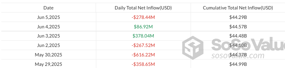 Sau một đợt phục hồi ngắn vào ngày 3–4 tháng 6, các quỹ Bitcoin ETF spot tại Mỹ lại ghi nhận dòng tiền rút ra vào ngày 5 tháng 6, với tổng giá trị 278 triệu USD, theo dữ liệu từ SoSoValue.
