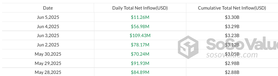 Theo SoSoValue, các Ether ETF spot của Hoa Kỳ đã chứng kiến 11,3 triệu USD tiền đổ vào vào ngày 5 tháng 6, đánh dấu 14 ngày liên tiếp có dòng tiền đổ vào. Tuy nhiên, dòng tiền đổ vào của ngày hôm qua đã giảm đáng kể so với 56,9 triệu USD tiền đổ vào vào ngày 4 tháng 6 và 109,4 triệu USD tiền đổ vào vào ngày 3 tháng 6.