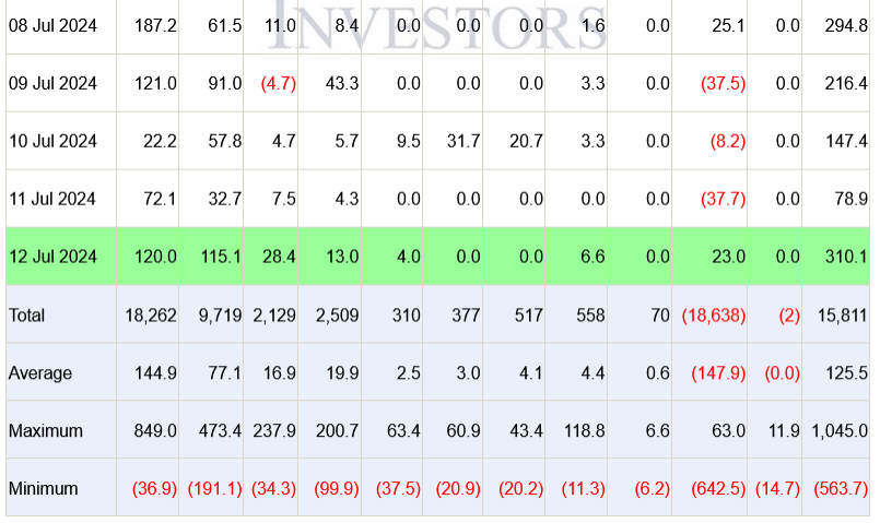 Dòng tiền chảy vào các Bitcoin ETF spot hàng ngày từ ngày 8 đến ngày 12 tháng 7. Nguồn: Farside Investors.
