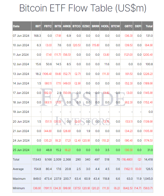 Sau một tuần dòng tiền chảy ra ròng, các quỹ Bitcoin ETF spot tại Mỹ đã chứng kiến ​​sự đảo chiều vào ngày 25 tháng 6, với dòng tiền vào ròng đạt 31 triệu USD.