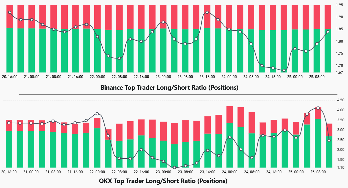 Tại Binance, các trader hàng đầu đã giảm vị thế long (kỳ vọng tăng) vào thứ Ba và thứ Tư, khiến tỷ lệ long/short rơi xuống 1,7 lần – mức thấp nhất trong hơn 30 ngày.