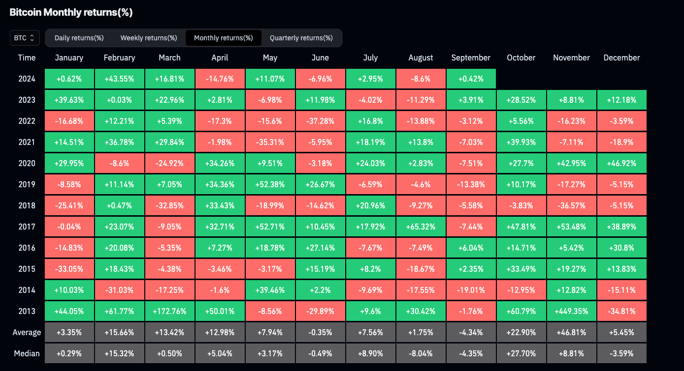 Về trung hạn, Gilbert cho biết các nhà đầu tư nên chuẩn bị cho sự biến động tiếp theo vào tháng 9. Theo lịch sử, tháng 9 là tháng tệ nhất đối với hành động giá Bitcoin, với mức lợi nhuận trung bình hàng tháng là -4,3% trong mười một năm kể từ năm 2013.