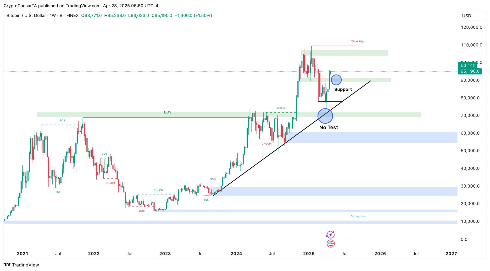 Cuối tháng 4, Bitcoin đã bật tăng mạnh từ vùng hỗ trợ 89.000–90.000 USD, một mức ngang quan trọng từng đóng vai trò hỗ trợ trong các diễn biến giá trước đó — củng cố thêm lập luận cho khả năng tiếp tục tăng.