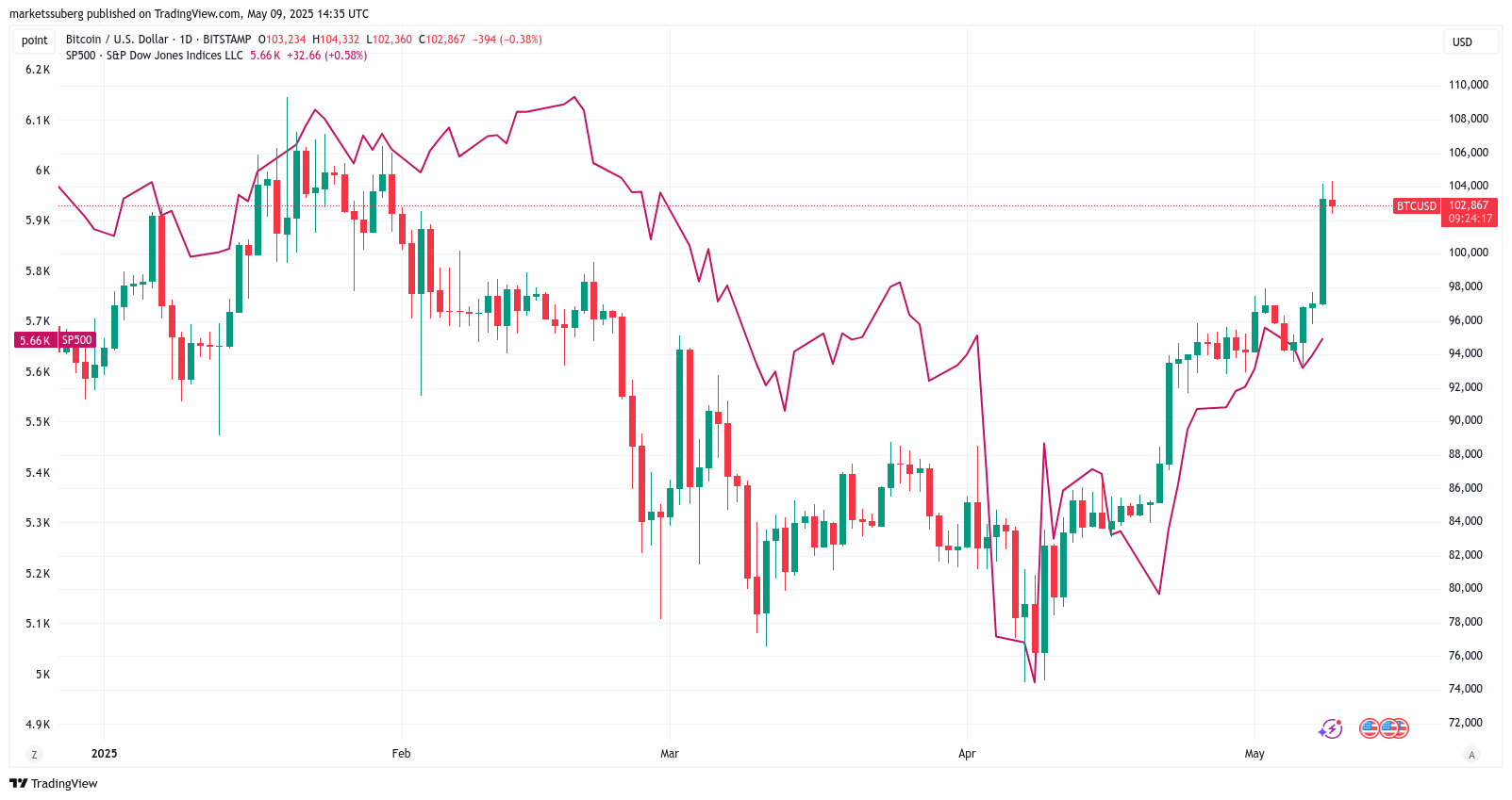 Biểu đồ 1 ngày của BTC/USD so với S&P 500. Nguồn: TradingView.