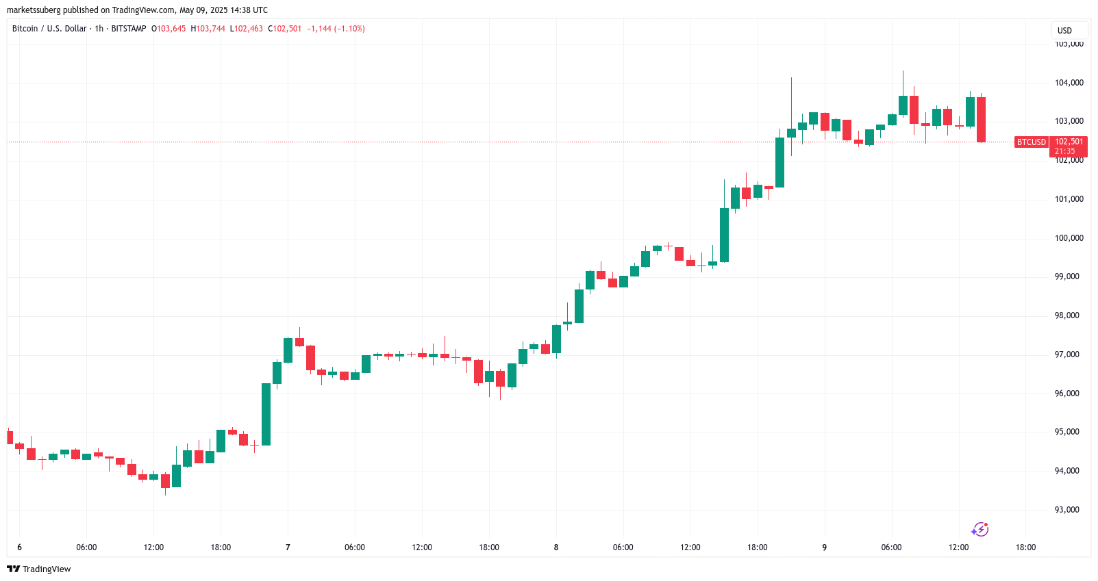 Cặp tiền này đã chạm mốc 104.332 USD trên Bitstamp, đánh dấu mức giá cao nhất kể từ cuối tháng 1 và là sự rẽ hướng rõ rệt so với xu hướng giảm chậm kéo dài phần lớn năm 2025.