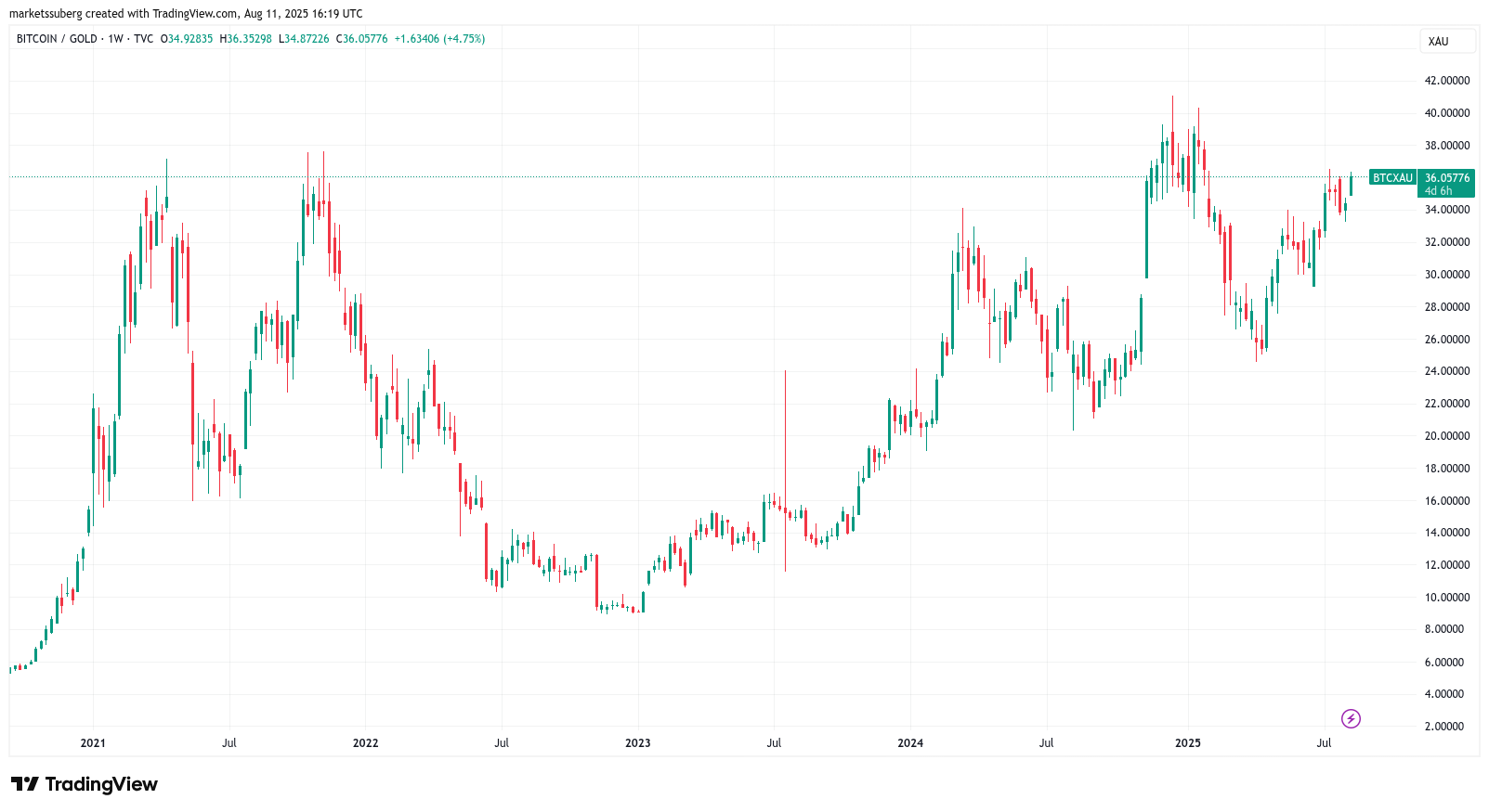 Đợt tăng giá vàng sau đó đã khiến BTC/XAU giảm 40% trước khi phục hồi, với 1 BTC hiện có giá trị khoảng 36 ounce.