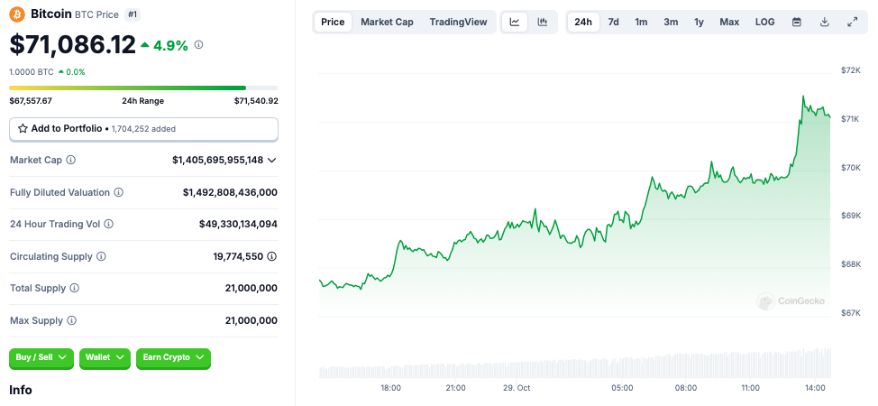 Tại thời điểm công bố, Bitcoin được giao dịch ở mức 71.086 USD, tăng 4,9% trong 24 giờ qua, mức cao nhất trong gần năm tháng, theo dữ liệu của CoinGecko.