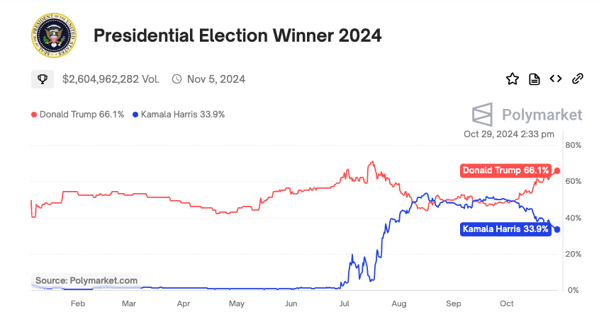 Ông Trump dẫn trước bà Harris gần 33% trên Polymarket. Nguồn: Polymarket.