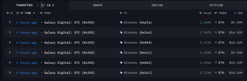 BitMine đã mua 65 triệuUSD ETH vào thứ năm. Nguồn: Arkham Intelligence.