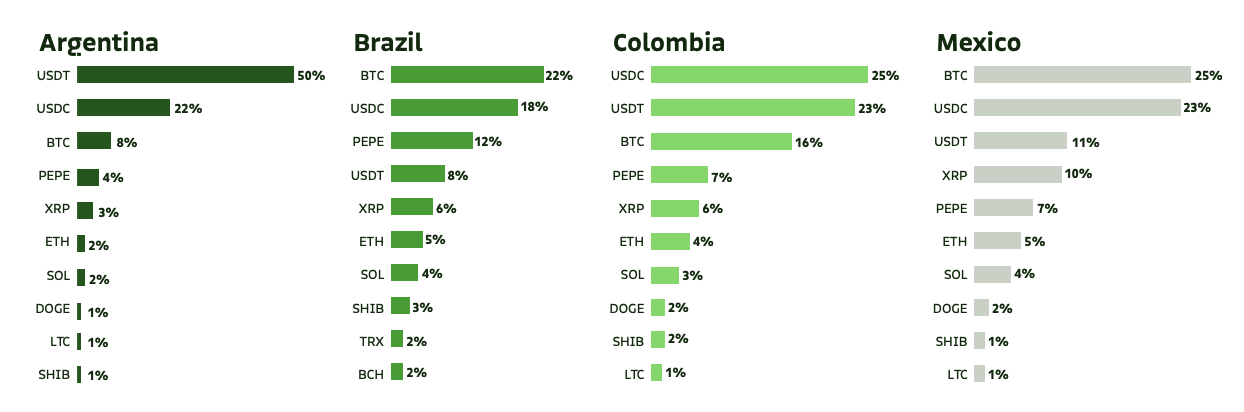 Một phân tích chi tiết hơn về sở thích địa lý giữa các quốc gia Mỹ Latinh cho thấy xu hướng sử dụng USDT ở Argentina đang gia tăng mạnh mẽ, nơi được biết đến với tỷ lệ áp dụng stablecoin cao do tỷ lệ lạm phát vượt quá 100%.