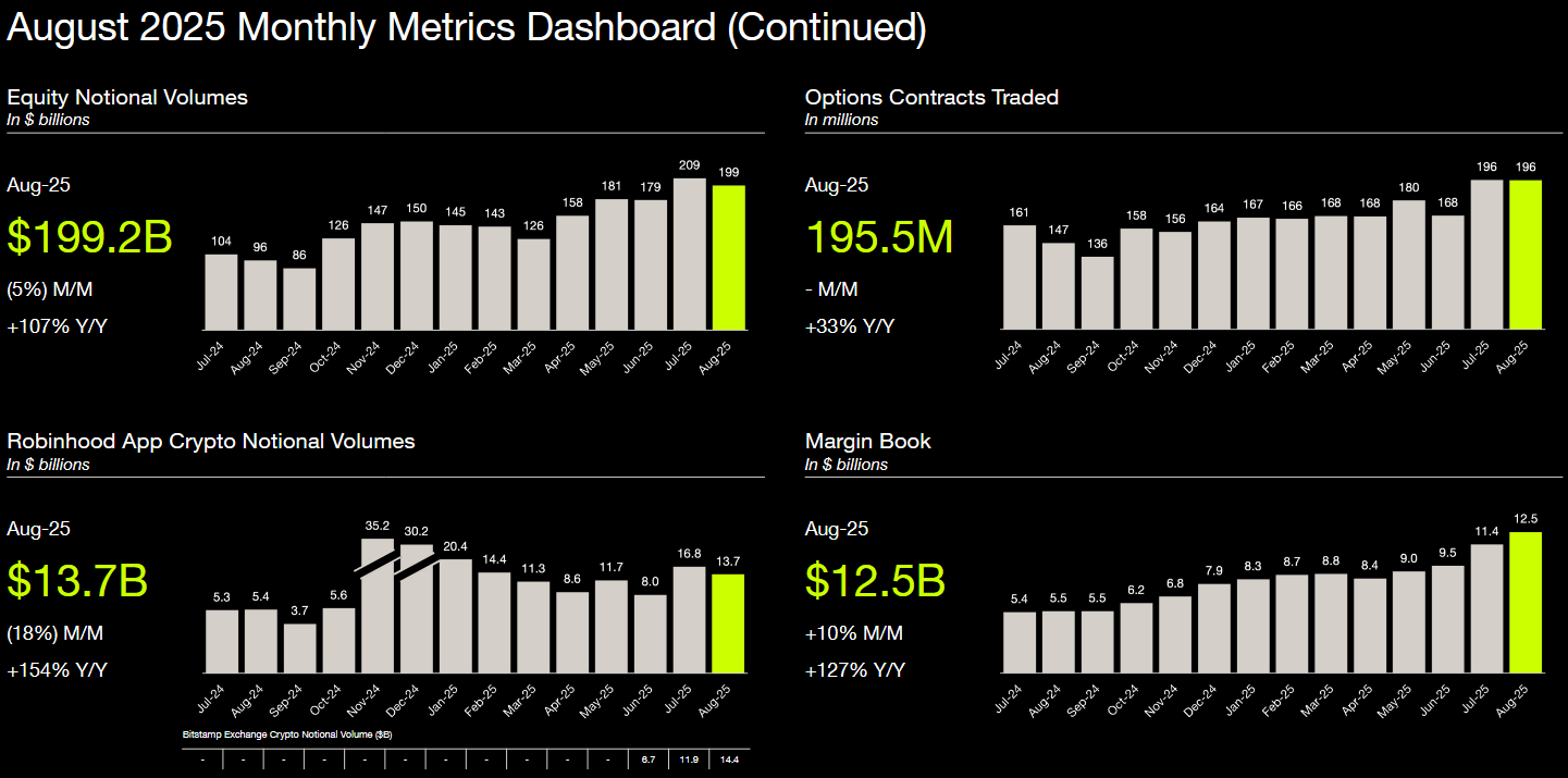 Dữ liệu cho thấy khối lượng này của Robinhood đã có xu hướng giảm kể từ tháng 11/2024, khi công ty ghi nhận quý kỷ lục, nhưng đã bật tăng trở lại trong tháng 7 trước khi sụt giảm vào tháng 8.