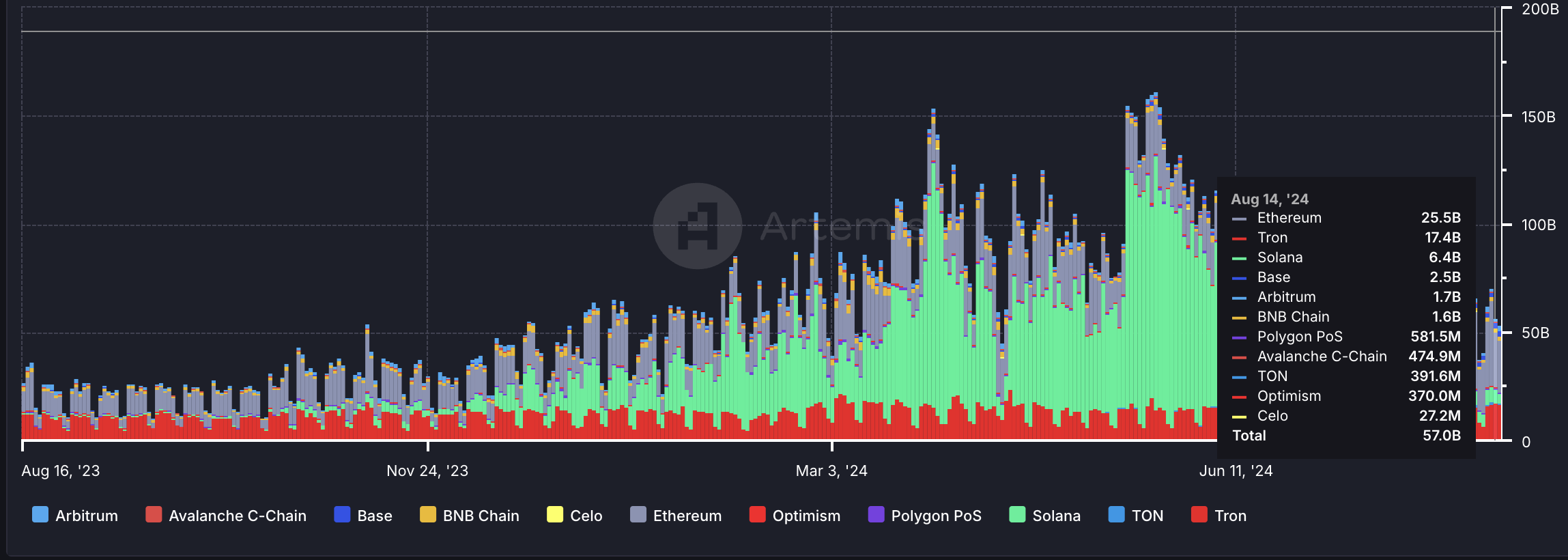 Hơn nữa, khối lượng stablecoin trị giá 17,4 tỷ USD được chuyển trên Tron vào ngày 15 tháng 8 cao hơn 222% so với khối lượng stablecoin trị giá 5,4 tỷ USD được chuyển vào ngày 15 tháng 8 năm 2023.