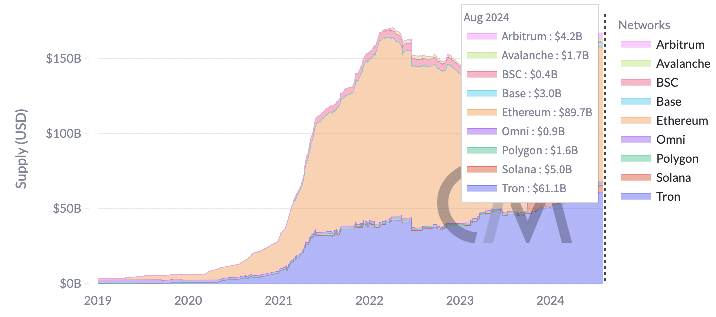 Tron theo sau Ethereum, blockchain thống trị nguồn cung thị trường stablecoin với 89,7 tỷ USD, chiếm 55,7% tổng nguồn cung.