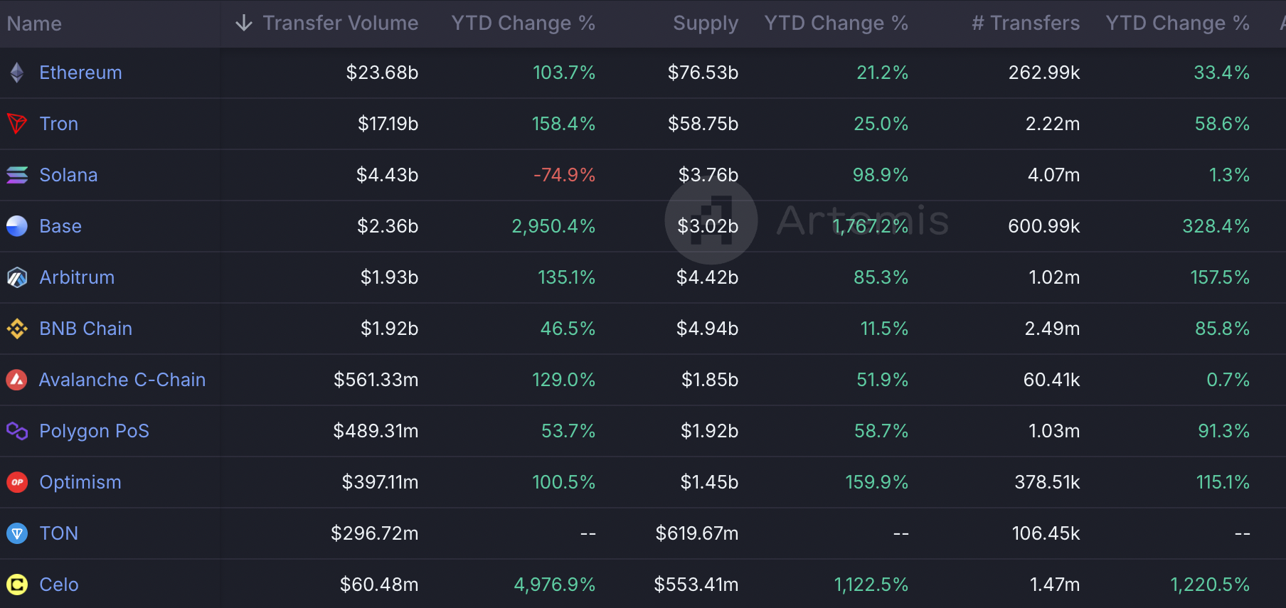 Sự tăng trưởng trong nguồn cung stablecoin trên Tron trùng với sự gia tăng về khối lượng chuyển tiền, tăng 5,1% trong 30 ngày qua và 158% tính đến thời điểm hiện tại, đạt 58,75 tỷ USD. Các chuỗi khác như Ethereum và BNB Chain chứng kiến khối lượng tăng lần lượt là 103% và 46,5% tính đến thời điểm hiện tại. Khối lượng chuyển stablecoin trên Solana đã giảm 75% trong cùng kỳ.