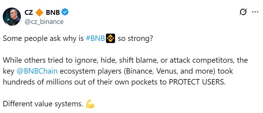 Trong khi một số thành viên cộng đồng nghi ngờ tại sao BNB “hầu như không bị ảnh hưởng” bởi sự cố này, đồng sáng lập Binance Changpeng Zhao đã bảo vệ tài sản này, nói rằng BNB mạnh vì những người tham gia hệ sinh thái BNB Chain “đã bỏ hàng trăm triệu USD từ túi của họ để bảo vệ người dùng”.