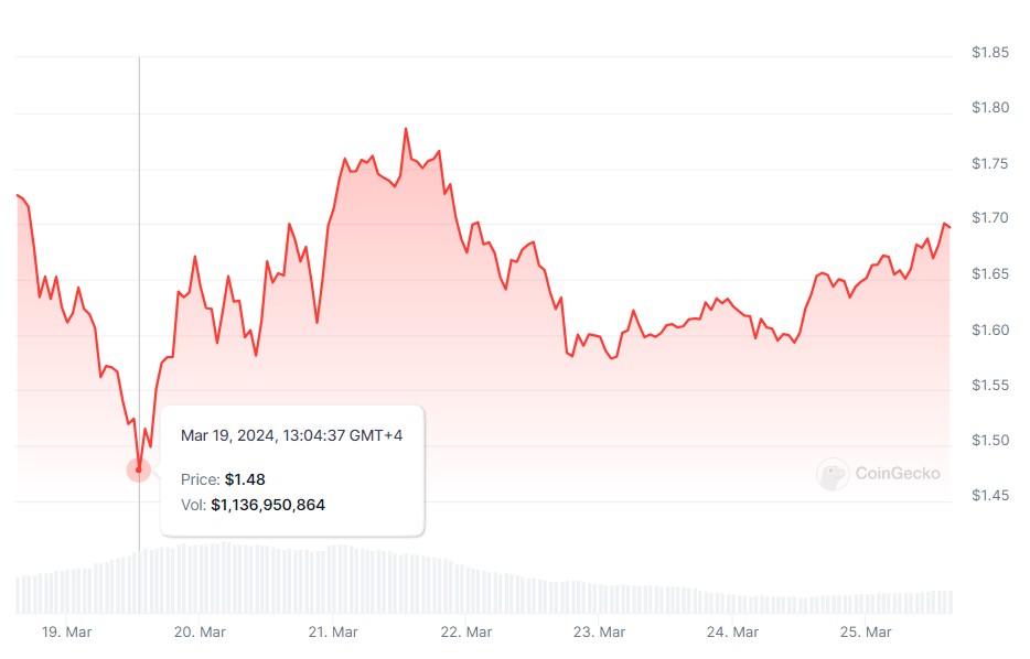 Trong bảy ngày qua, token đã giảm xuống mức thấp nhất là 1,48 USD vào ngày 19 tháng 3 nhưng đạt mức cao nhất là 1,79 USD vào ngày 21 tháng 3. Tại thời điểm viết bài, token đang dao động ở mức 1,70 USD.