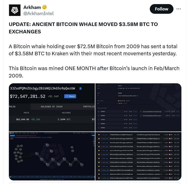 Arkham Intelligence chỉ ra trong bài đăng ngày 4 tháng 10 rằng: “Số Bitcoin này được khai thác MỘT THÁNG sau khi Bitcoin ra mắt vào tháng 2/tháng 3 năm 2009”.
