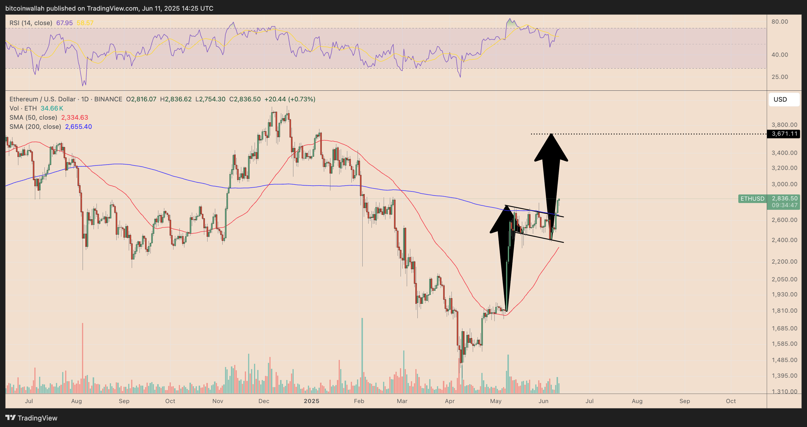Sự đột phá và khối lượng giao dịch tăng cho thấy niềm tin mạnh mẽ của các nhà giao dịch rằng giá ETH có thể tăng lên mục tiêu cờ tăng giá khoảng 3.670 USD, tăng 30% so với mức hiện tại vào cuối tháng 6.